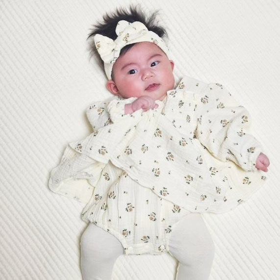 Baby Girl Dress Cotton Romper outfit with matching headband bow. This floral vintage romper is perfect to throw on from fall through winter, and it comes complete with long sleeves, and strong snaps at the legs for simple changes.