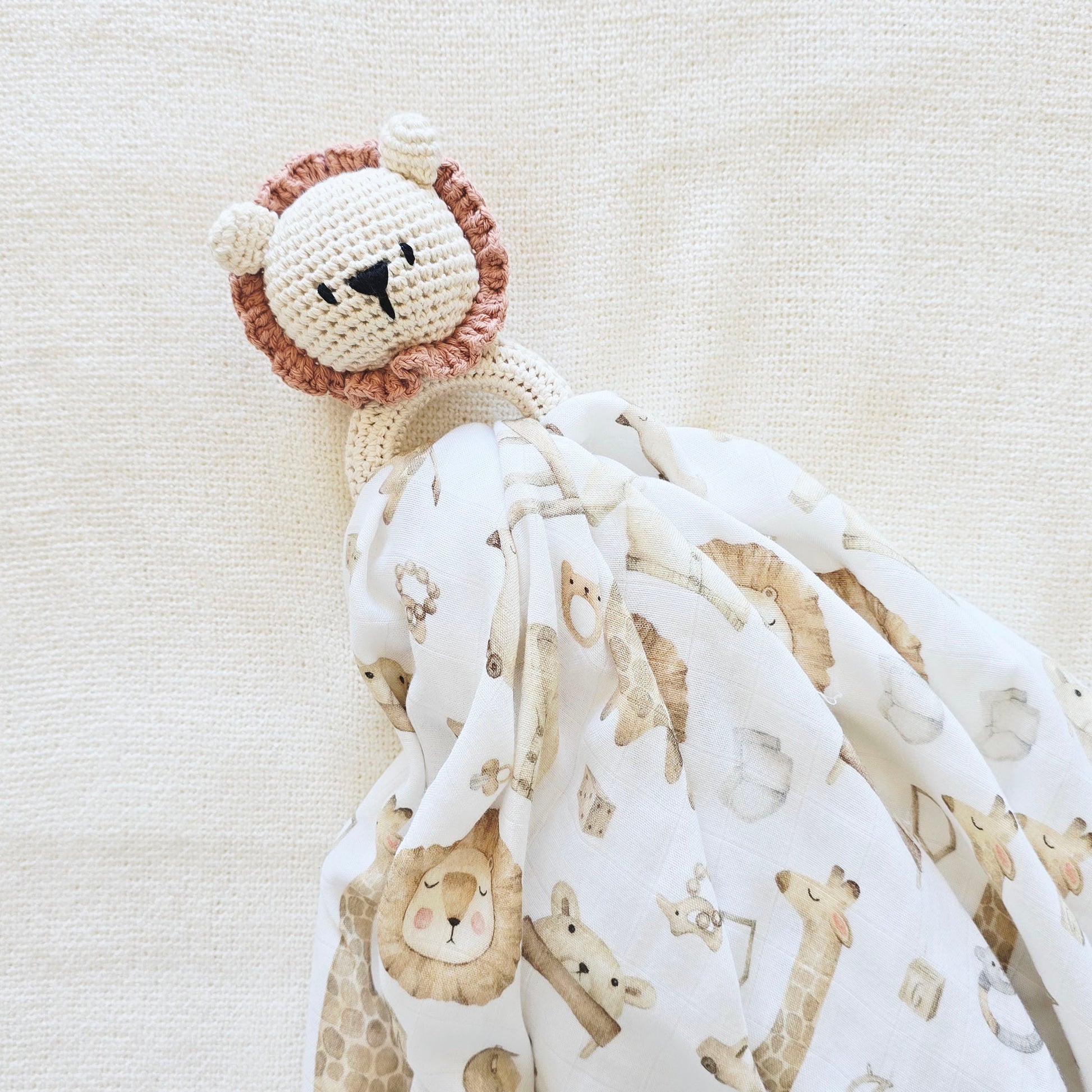 Our Lion crochet rattle is hand-knitted and made out of 100% organic cotton, wrapped around an organic beechwood ring.
